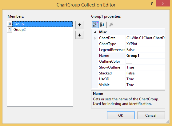 The ChartGroup Collection Editor allows the user to set or modify Group1 and Group2's properties. For more information on the ChartGroup, see Defining the ChartGroup Object.