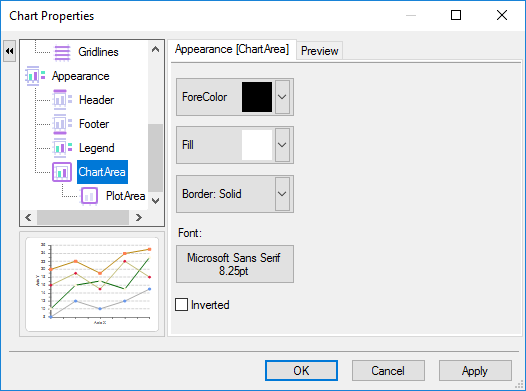 The ChartArea tab contains the ForeColor, Fill, Border, and Font properties, plus an Inverted property to invert the chart axes.
