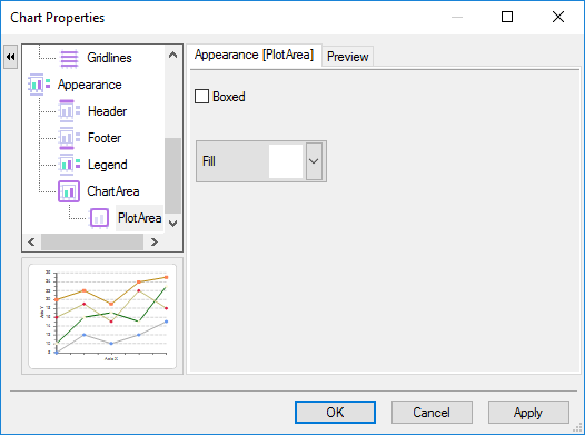 The PlotArea element contains a Fill and Boxed property. Clicking on the Boxed check box will create a box around the plot area in the chart.