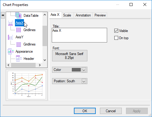 You can select Axis X, Axis Y, or Axis Y2 to modify or create the format style, scale, and annotation of the axes. Each axes element (AxisX, AxisY, and AxisY2) contain the following tabs in the upper right pane of the Chart dialog box: the name of the selected element (AxisX, AxisY, or AxisY2), the Scale, the Annotation, and the Preview tab.