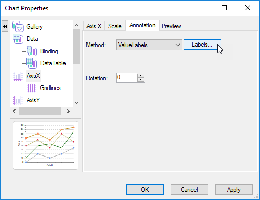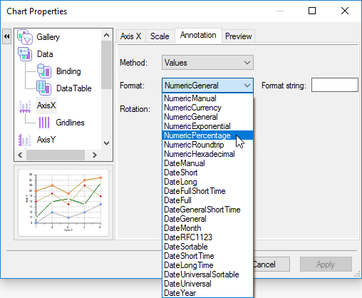 The Annotation tab allows you to specify whether you would like the AxisX, AxisY, or AxisY2 to be labeled as Values or ValueLabels. If you select Values from the Method drop-down box a Format drop-down box will appear. Here you can select from various types of formats. Also, you can specify the format string in the Format string textbox. For more information see the Values Annotation. For more information about the Format types, see FormatEnum Enumeration.
