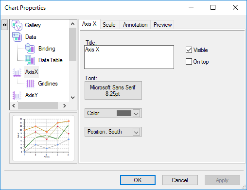The screen shot below represents the tab name for the selected Axis, in this example it is Axis X. In the Axis tab you can specify the title, font, color, and position of the axis. In addition you have the option to make the title for the axis appear on top by selecting the On top check box.