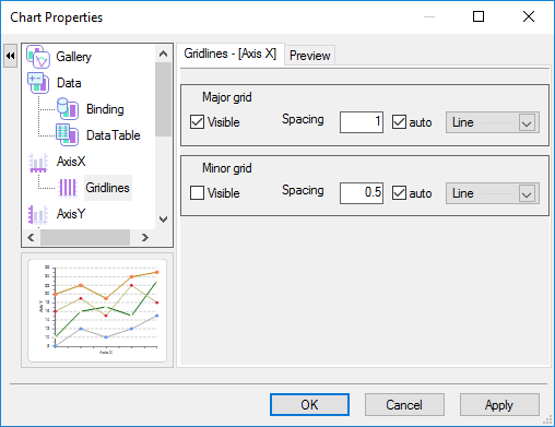 In the Gridlines tab you can add a major or minor gridline or both gridlines on either axes to improve the readability of the chart. If you would like to see the gridlines, simply check visible in the Major Grid and Minor Grid section. You can specify the spacing between each major or minor grid line by typing the amount in the Spacing text box. Also, you can specify the line style type for each grid line.