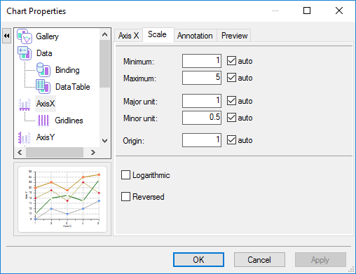 The Scale tab allows you to set the Minimum, Maximum, Major Unit, Minor Unit, and Origin property. In the example below the auto button was enabled so all the values for each property would be set to their default values. Your axis can also be Reversed and/or Logarithmic by clicking on the box.