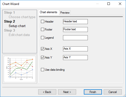 The next step in the chart wizard provides you with the ability to create or modify the Header, Footer, and Legend, as well as the titles that you wish to specify for Axis X and Axis Y. You can specify a title for the X-axis or Y-axis by typing in the corresponding text box. Clicking on the check box enables the Chart element to appear in your chart. For more details about these elements, see Customizing Chart Elements. You can check the Use data binding checkbox if you want to link your chart to an existing database.
