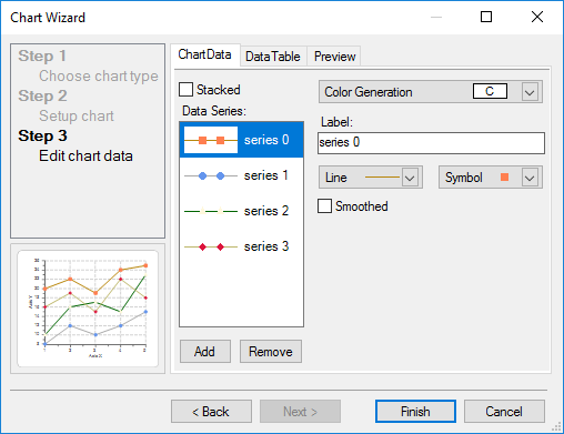 Under the ChartData tab, you can add or remove Data Series, specify the appearance of each data series such as the Labels, Linestyle, and Symbols. You can check the Smoothed checkbox if you want the line of a specific series in the data to appear smooth. This can be done by selecting a series in the Data Series list box and then checking the Smoothed check box.
