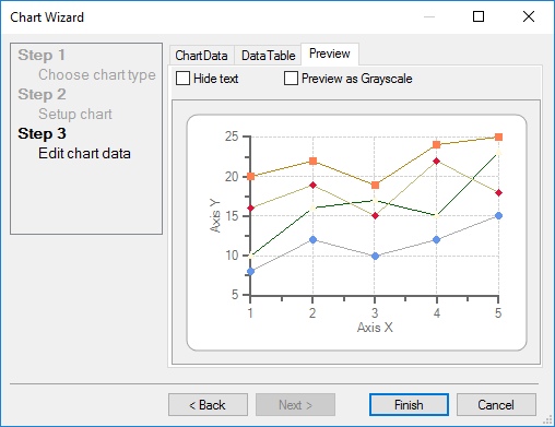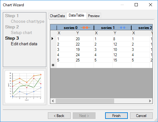The next step in the Chart Wizard is to create or modify the appearance of the data chart series in the data area of the chart. This step includes a ChartData, DataTable, and Preview tab.