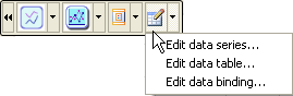 The Data button has a drop-down menu which includes three options for the user to select from: Edit data series, Edit data table, and Edit data binding. The Edit data series item exposes the Chart Properties designer for the data series. The Edit data table item exposes the Chart Properties designer for the data table. The Edit data binding item exposes the Chart Properties designer for the data binding. If you would like to edit another element other than the data series, data table, and data binding you can click on the button to navigate to a different chart element in the tree view of the Chart Properties designer.