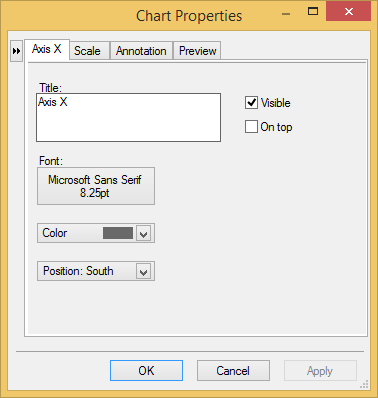 The following image represents the properties for the AxisX when the Properties command button is selected from the Axis X toolbar: