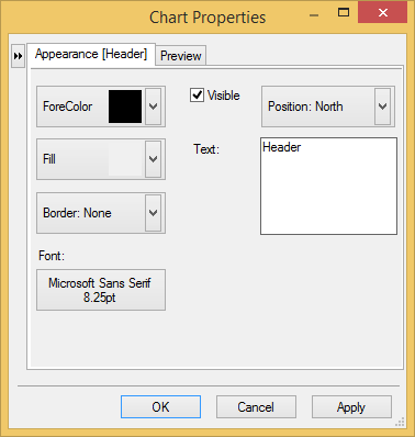 The properties command button exposes the Chart Properties designer for the Header and Footer elements when the user clicks on the properties command button.