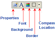 The floating toolbar for the Header and Footer element includes the following command buttons: Properties, Font, Background, Border, and a Location for the Header and Footer elements of the C1Chart control. The figure below provides a label for each of the command buttons for the Header and Footer toolbar.