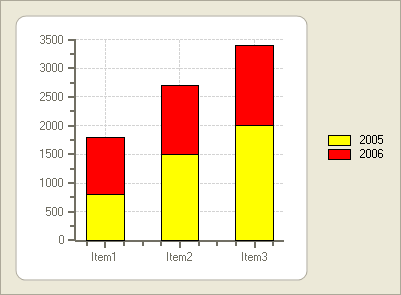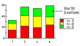 A Stacking Bar chart draws each series as a portion of a stacked bar cluster, the number of clusters being the number of points in the data. Each bar displays the nth data point in each series. Cylinder, Pyramid, and Cone Bar charts can also be stacked by setting the Stacked property to True. Using the LineStyle, the fill properties of each series can be customized. For more information, see Line and Symbol Styles for the Series.