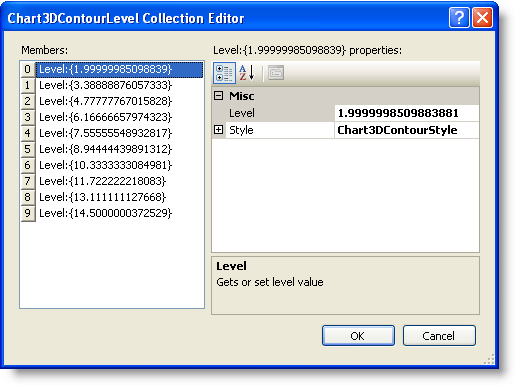 The Chart3DContourLevel Collection Editor is used for editing each contour level's style such as their fill color and line style.