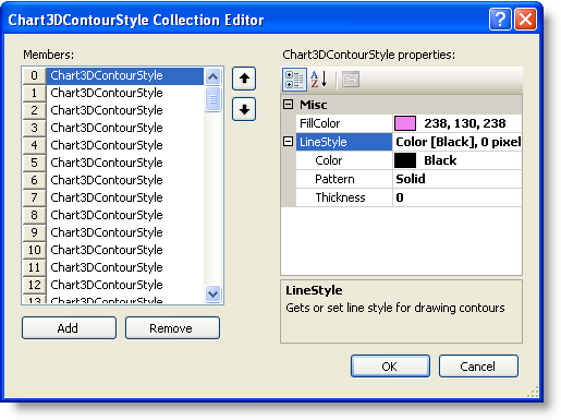 The Chart3DContourStyle Collection Editor is used for editing each contour level's style such as their fill color and line style.