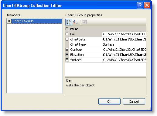 - In the Properties window, expand the ChartGroups node, then click on the ellipsis button next to the ChartGroupsCollection property. The Chart3DGroup Collection Editor opens.