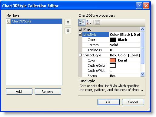 The Chart3DStyle Collection Editor allows the user to apply line styles and symbol styles to the 3D Chart.