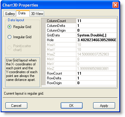 Select the Data tab from the Chart3D Properties dialog box to select the type of data layout and set its Chart3DDataSetGrid properties.