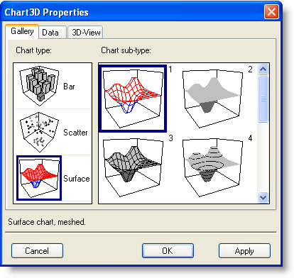 The Gallery tab provides options for choosing a chart type and/or a sub-type of a chart. The available chart types are located in the left side of the Gallery tab page and the available chart sub-types are located on the right side of the Gallery tab page. To see a description of all chart type selections, see Basic 3D Chart Types. You can choose from a variety of simple chart types or you could click on complex types to add more functionality to your chart.