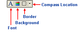 The toolbar for the Header and Footer element includes the following command buttons: Font, Background, Border, and a Compass Location for the Header and Footer elements of the C1Chart3D control. The figure below provides a label for each of the command buttons for the Header and Footer toolbar.