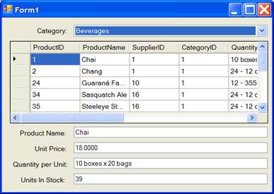 Repeat this step to bind the other TextBox controls to the UnitPrice, QuantityPerUnit, and UnitsInStock fields.
