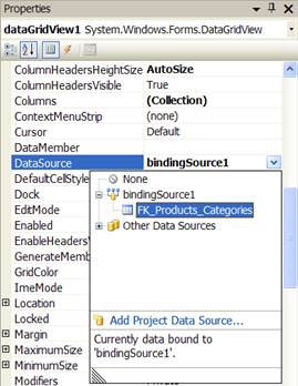 For the DataGridView, use the drop-down editor in the property grid to set the DataSource property to FK_Products_Categories, the item that appears under bindingSource1 and represents the products under the currently selected category. The image below shows what the drop-down editor looks like just before the selection is made: