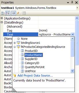 Finally, select each of the TextBox controls and use the drop-down editor in the property window to bind the Text property to the corresponding element in the currently selected product. For example: