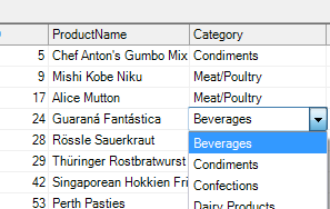 When you are done, run the project again and look at the Category and Supplier columns. Notice that now the grid shows the category name and supplier’s company name instead of the generic strings. Also notice that you can edit the product’s category and the product’s supplier by picking from a drop-down list, complete with auto search functionality.