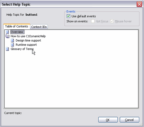 Within this dialog box, you can specify the topic to map to the control through the Table of Contents tab by simply selecting it, or you can choose the topic's context ID from the Context IDs tab. Additionally, you can specify here whether a topic should be shown when: the control gets focus; the mouse hovers over it; both; or neither, in which case, you can show the topic programmatically.