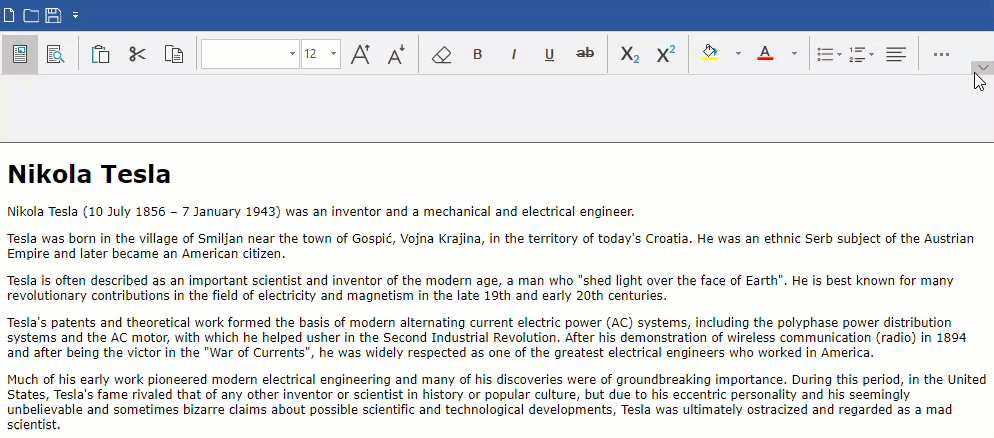 Editor provides a Ribbon-based toolbar that lets you access various word-processing commands. The Editor Ribbon comes with a flat-style user interface with tabs, groups, items, menu, etc. and it also lets you switch between full and simplified views. For instance, the following image shows the C1Editor Ribbon in a simplified view.