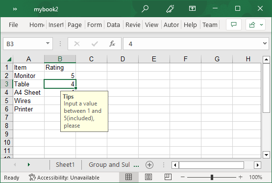 The following image showcases data validation applied to the Excel worksheet. Here, we display an input message to notify the end-users to enter a value ranging between 1-5.