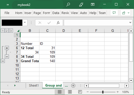 To create groups and subtotals in Excel, use the following code. In this example, we create groups by defining outline levels of rows and columns and show subtotals by applying a formula on cell values. For more information on cell formulas, see Apply Formula.