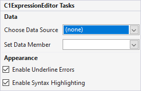 In Visual Studio, the Expression Editor control includes a smart tag. This smart tag provides quick and easy access to various common properties through the C1ExpressionEditor Tasks smart tag panel. To access the C1ExpressionEditor Tasks smart tag panel, click the smart tag icon () in the upper right corner of the editor. This opens the C1ExpressionEditor Tasks smart tag panel as shown in the following image: