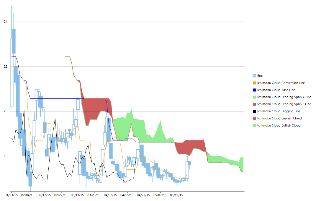 The following example considers stock data for a company Box Inc. over a period of time and plots ichimoku cloud on the same financial chart, as shown in the image above. The example uses data from a JSON file, and DataService.cs class is created to access the JSON file.