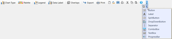 You can also add new items such as buttons, split buttons, separators, dropdown, combo boxes, etc. to the FinancialChart toolbar using Add More Items button ( ), which appears at the right-most corner of the toolbar at design time. This button opens a dropdown of items that can be added to the toolbar as shown in the following image.