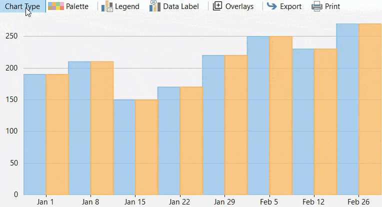 Financial Chart Toolbar provides you access to some basic chart operations at runtime. It lets you change chart type/color palette, alter current legends/data label settings, export, print charts, and do much more. The toolbar helps you to customize the chart appearance as shown in the following GIF.