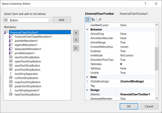 FinancialChart provides access to many basic operations via toolbar. However, there might be a scenario where you would want to add more UI items to the toolbar to extend the basic functionalities. This section discusses how to add UI items to the toolbar at design time or through code.