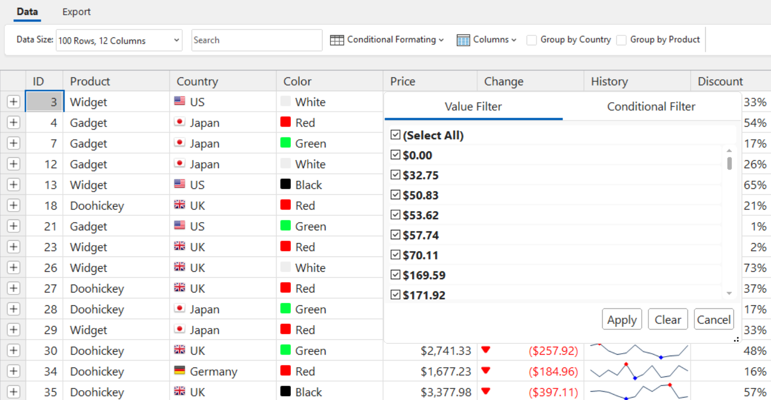 In FlexGrid, filtering can be enabled by setting the C1FlexGrid.AllowFiltering property to true. This enables the default ColumnFilter on all columns of the grid. The ColumnFilter lets the users choose from ValueFilter and ConditionFilter at runtime.