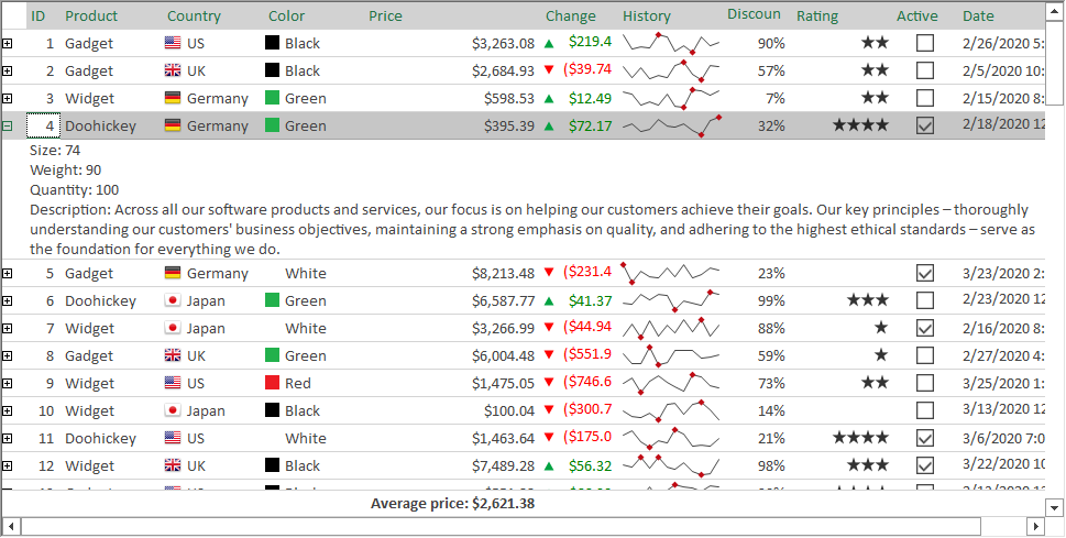 One of the main strengths of FlexGrid is the ability to customize almost every aspect of appearance of the entire grid and individual cells. In addition to standard format strings and cell styling, FlexGrid goes above and beyond most .NET datagrid components by providing complete control over the cell drawing using its OwnerDrawCell event.