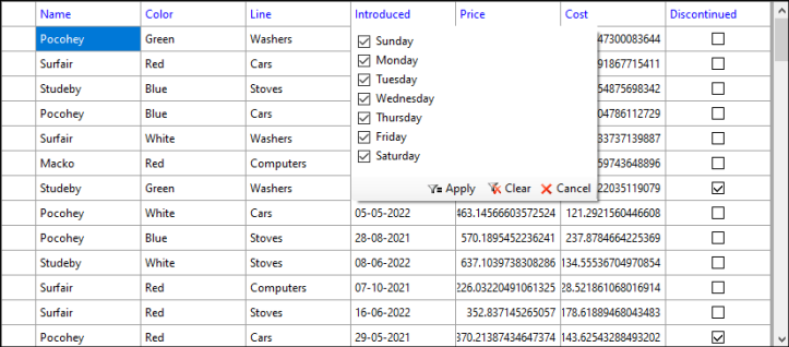 This walkthrough takes you through the steps of creating a custom column filter to filter column data by days of week.