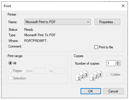 The Print option in Report menu, which when clicked opens the Print dialog. It lets you print the report data using different options including Microsoft Print to PDF.