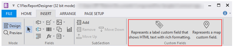 Note: The custom fields can only be generated by registering the assembly in FlexReportDesigner (.NET4.0) and C1FlexReportDesigner.4.exe.settings. It would require the use of the 4.0 versions of the respective controls and scaling the application to 4.0 .NET framework.