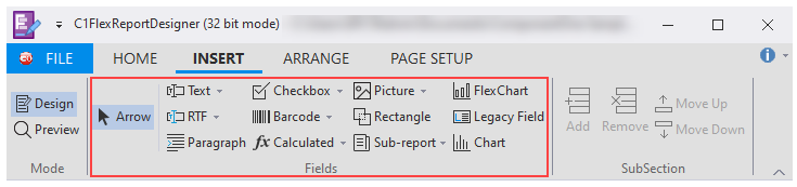 Fields within a report represent data mapping between a data source and the template of the report. FlexReport allows you to add an in-built field as well as a custom field. To add fields in FlexReport, you simply need to use the Fields group of Insert tab in FlexReportDesigner, and click the desired field and drop it into the report.