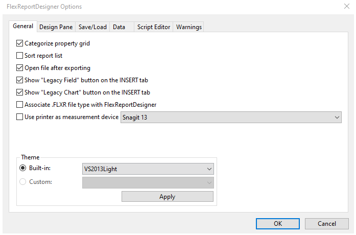 buttons in the Insert tab, select the check-boxes against Show "Legacy Chart" button on the INSERT tab from the FlexReportDesigner Options on the General tab.