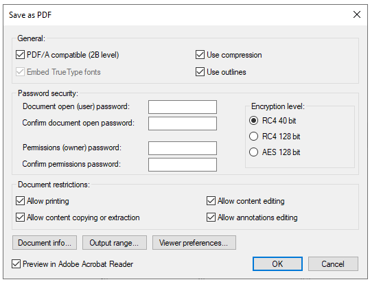 Fill the dialog box and then click OK. Your exported PDF/A document opens in the PDF reader installed on your computer.