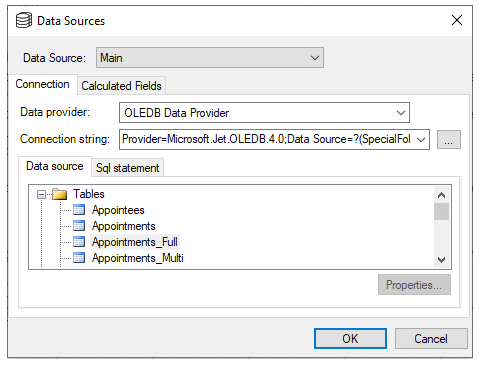 The Tables page shows a list of data objects currently defined on the form (the page will not be visible if there aren't any valid data sources on the form). Alternatively, you can use the Connection string to build and select a connection string and record source as usual.