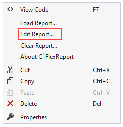 You can also click the smart tag () of the component to open the C1FlexReport Tasks menu and select the Edit Report option.