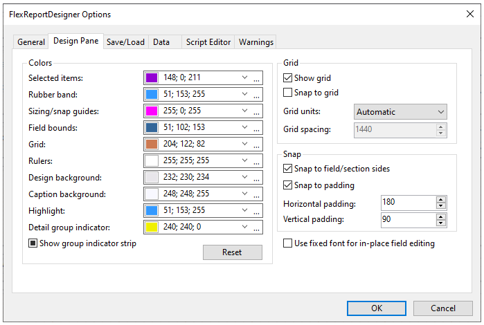 The Design Pane tab allows you to select colors, and alter properties related to Grid, Snap and Padding in the FlexReportDesigner.