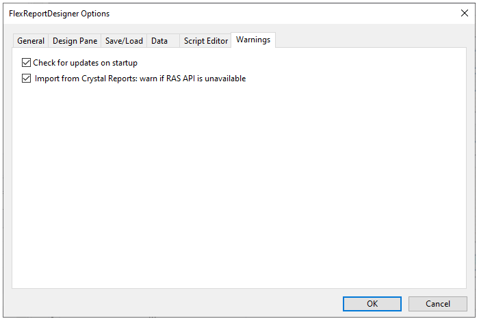 - Check for updates on startup: Selecting this option checks for any updates when the FlexReportDesigner application is opened.