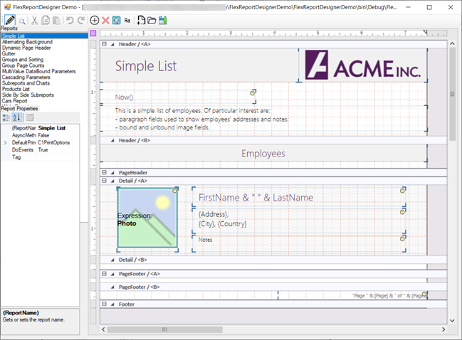 The following steps describe how to create a sample designer and implement a simple report using the C1FlexReportDesigner control. The purpose of this sample designer is to illustrate how the FlexReportDesigner control integrates with a designer application. It allows you to load and save files containing multiple reports, edit and preview reports, add and remove reports from the file, undo/redo, and modify reports.