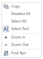 FlexViewer has a default context menu that provides a convenient way of performing many commands quickly without having to navigate to the ribbon. The FlexViewer control provides options such as Copy, Deselect All, Select All, Select Tool, Zoom In, Zoom Out and Find Text in its context menu.